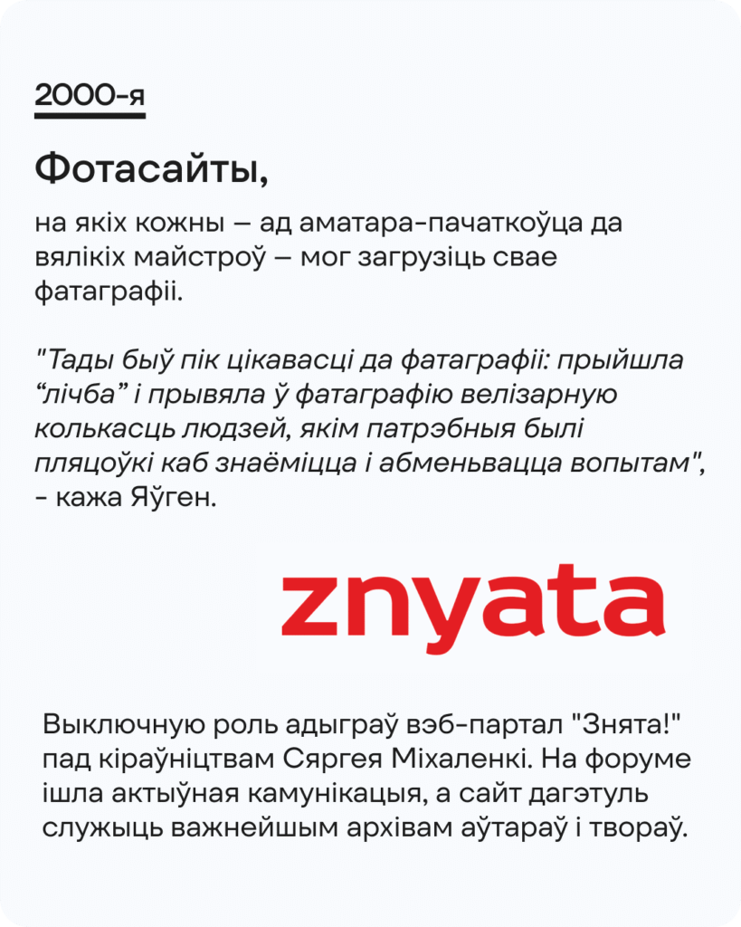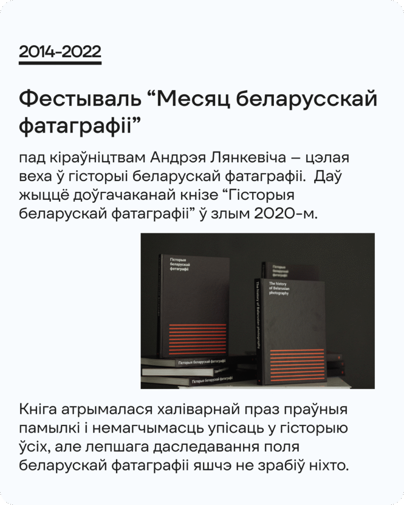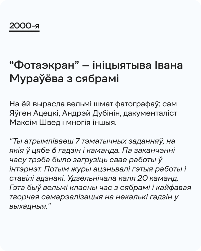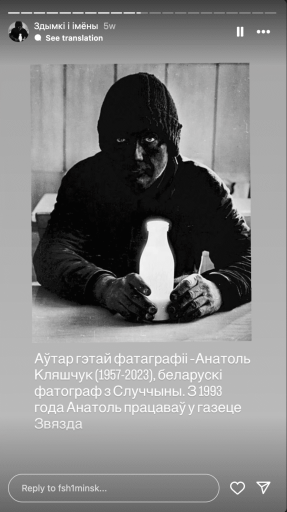Неяк мы праводзілі ў нас у stories у Instagram фотагульню “Адгадайце знакамітыя беларускія фатаграфіі”. І быў здымак, да прыкладу, Анатоля Клешчука. Гэта чалавек, які здымаў наступствы Чарнобыля, дзяцей у інтэрнатах, прысвяціў сваё жыццё беларускай прыродзе, гісторыям простага чалавека, як бы гэтае азначэнне ў сучасных рэаліях ні гучала. Гадоў 20 – і гэтае імя проста заваліць пластом інфармацыі. Ніхто нічога не даведаецца, не напіша і ўсё — ён знікне. Гэта глабальная трагедыя для любога аўтара, які прысвяціў сваё жыццё творчасці. Мы спрабуем праз нейкія свае рэсурсы такія імёны замацоўваць, падсвятляць.