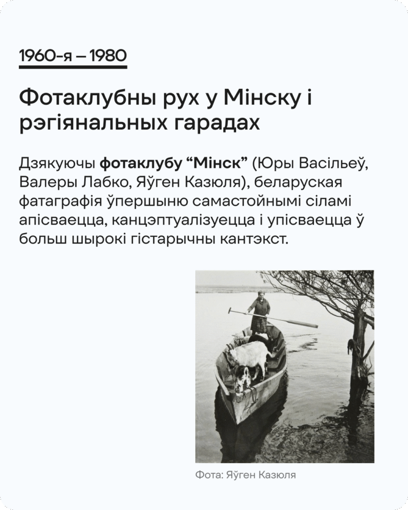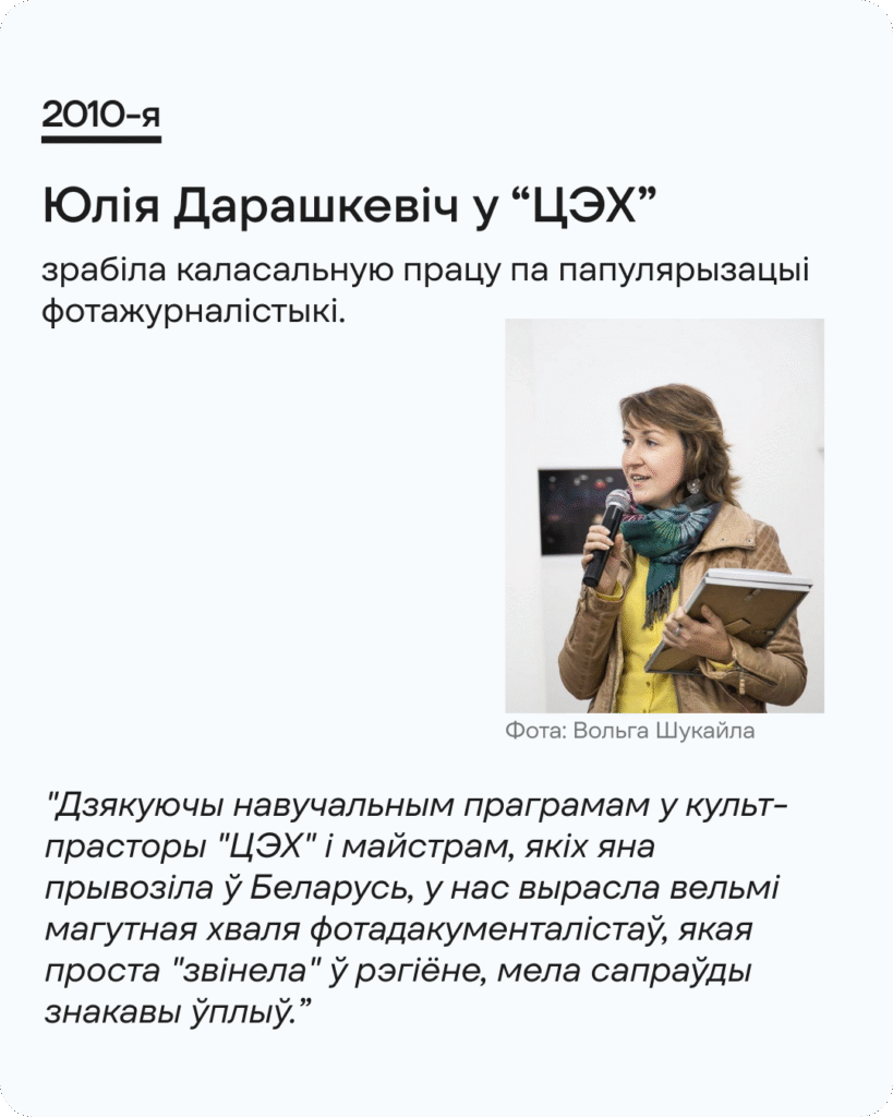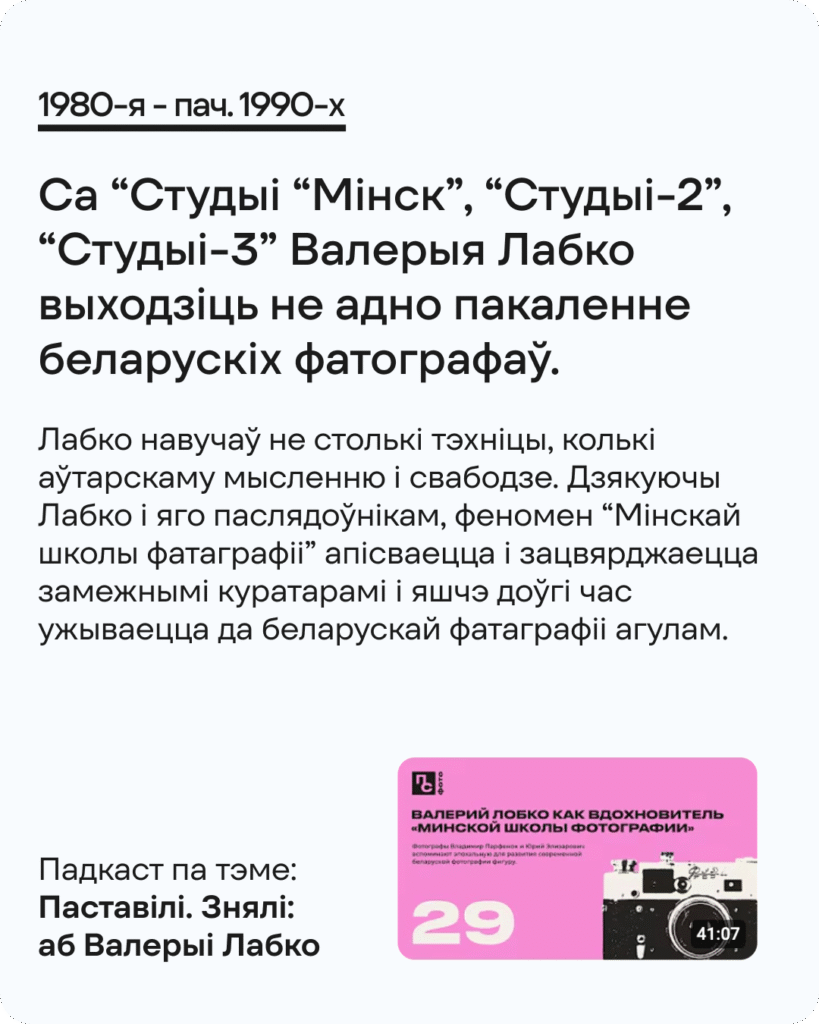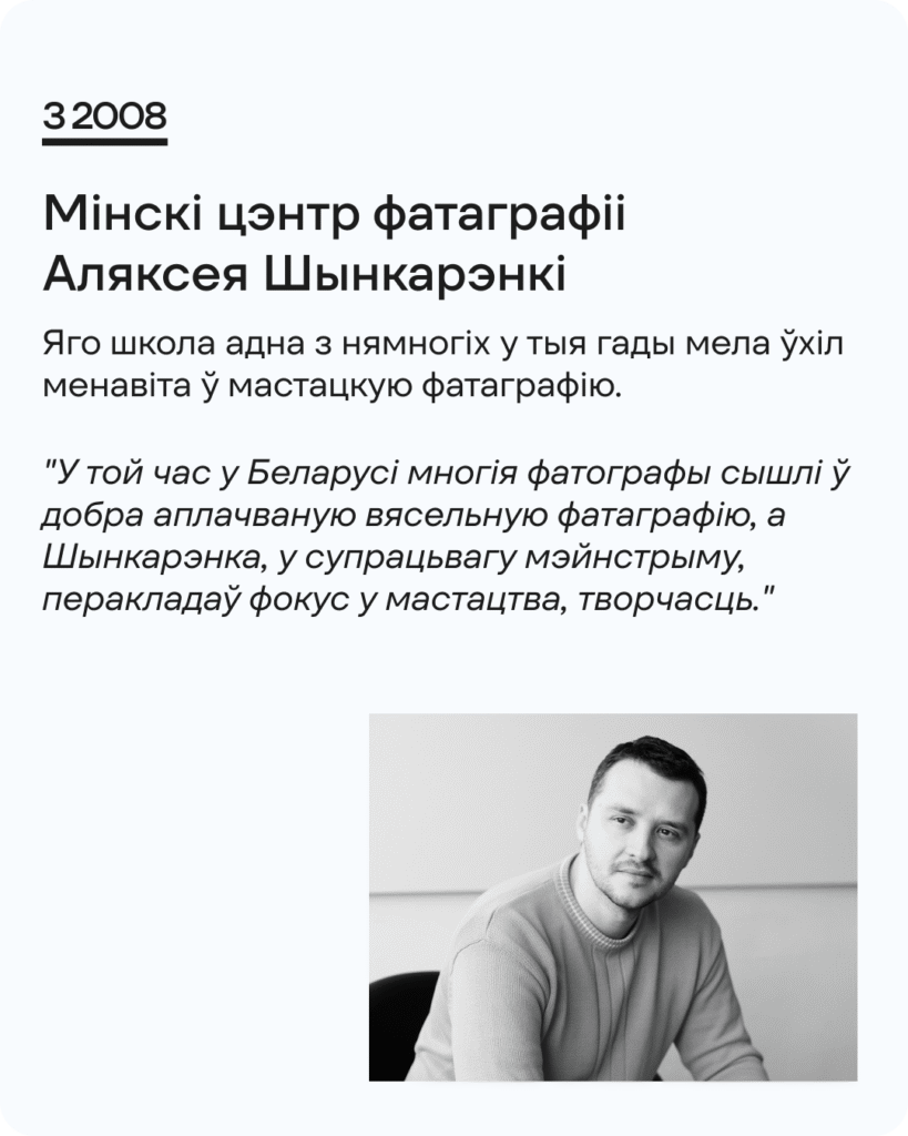 Неяк мы праводзілі ў нас у stories у Instagram фотагульню “Адгадайце знакамітыя беларускія фатаграфіі”. І быў здымак, да прыкладу, Анатоля Клешчука. Гэта чалавек, які здымаў наступствы Чарнобыля, дзяцей у інтэрнатах, прысвяціў сваё жыццё беларускай прыродзе, гісторыям простага чалавека, як бы гэтае азначэнне ў сучасных рэаліях ні гучала. Гадоў 20 – і гэтае імя проста заваліць пластом інфармацыі. Ніхто нічога не даведаецца, не напіша і ўсё — ён знікне. Гэта глабальная трагедыя для любога аўтара, які прысвяціў сваё жыццё творчасці. Мы спрабуем праз нейкія свае рэсурсы такія імёны замацоўваць, падсвятляць.