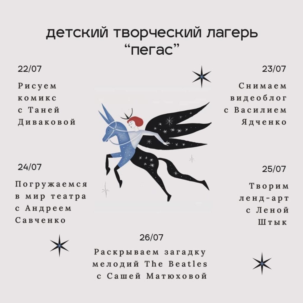 На працягу пяці дзён удзельнікі і ўдзельніцы лагера будуць маляваць комікс, здымаць відэаблог, пагружацца ў свет тэатра, тварыць лэнд-арт і раскрываць загадку мелодый The Beatles.